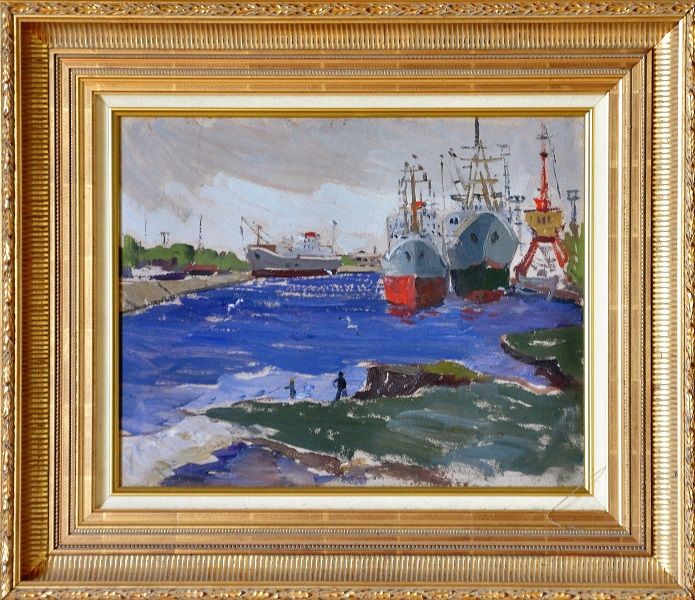 "Le port de Riga" - non daté Huile sur carton fort 40 x 50 cm encadré